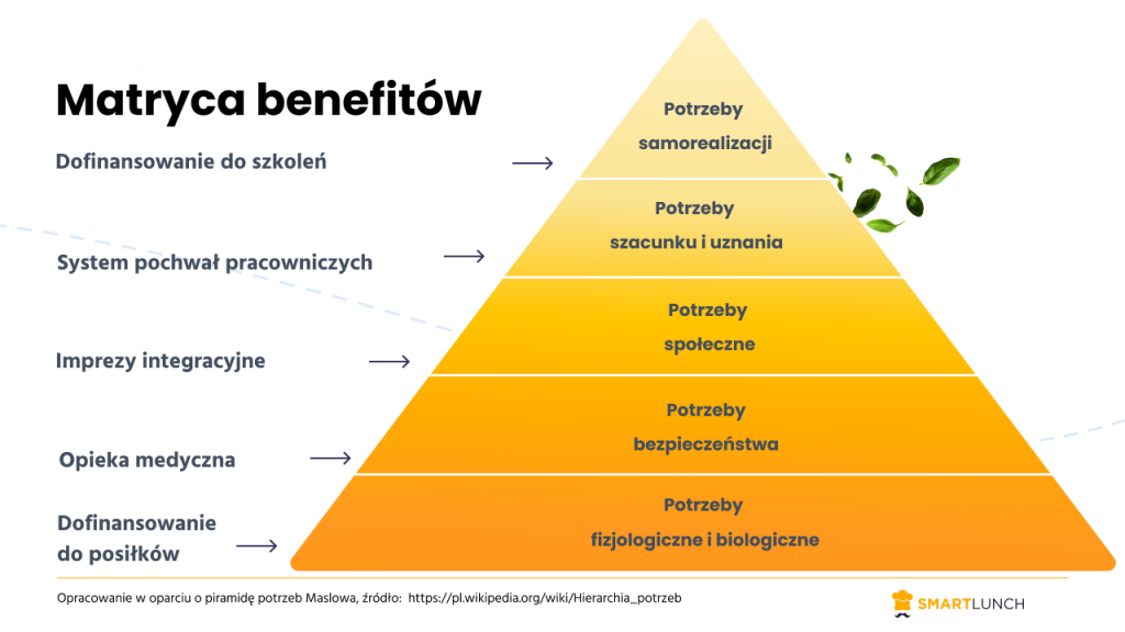 Nasi pracownicy mają swoje potrzeby, a benefity służą ich spełnieniu. Ponad 100 lat temu, Abraham Maslow określił, które potrzeby ludzkie są najważniejsze, a bez których człowiek może sobie poradzić. Z naszych doświadczeń wynika, że pracownicy mniej odczują likwidację budżetu szkoleniowego niż odebranie opieki medycznej.