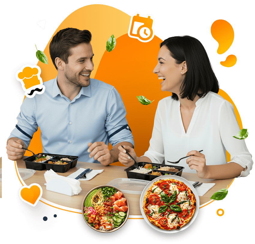 Posiłki trafiają prosto do biura lub na home office. Spotkanie na mieście? Zjedz w lokalu albo odbierz zamówienie z partnerskiej restauracji.